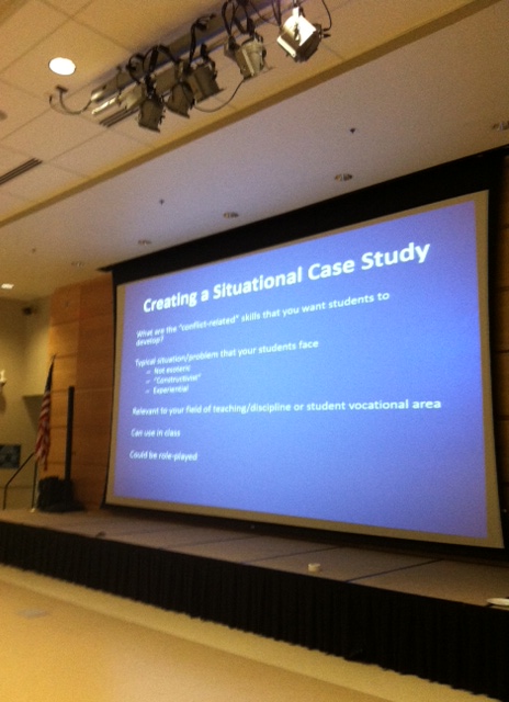 I then worked with a smaller group of faculty and staff. Here we explored ways to infuse into a range of courses conflict resolution scenarios and role-play activities. I asked them, working in teams, to develop a “Situational Case Study” that would explore a specific conflict resolution skill or aptitude. I have found that experiential learning – were students engage in activities – is the best way of teaching.
