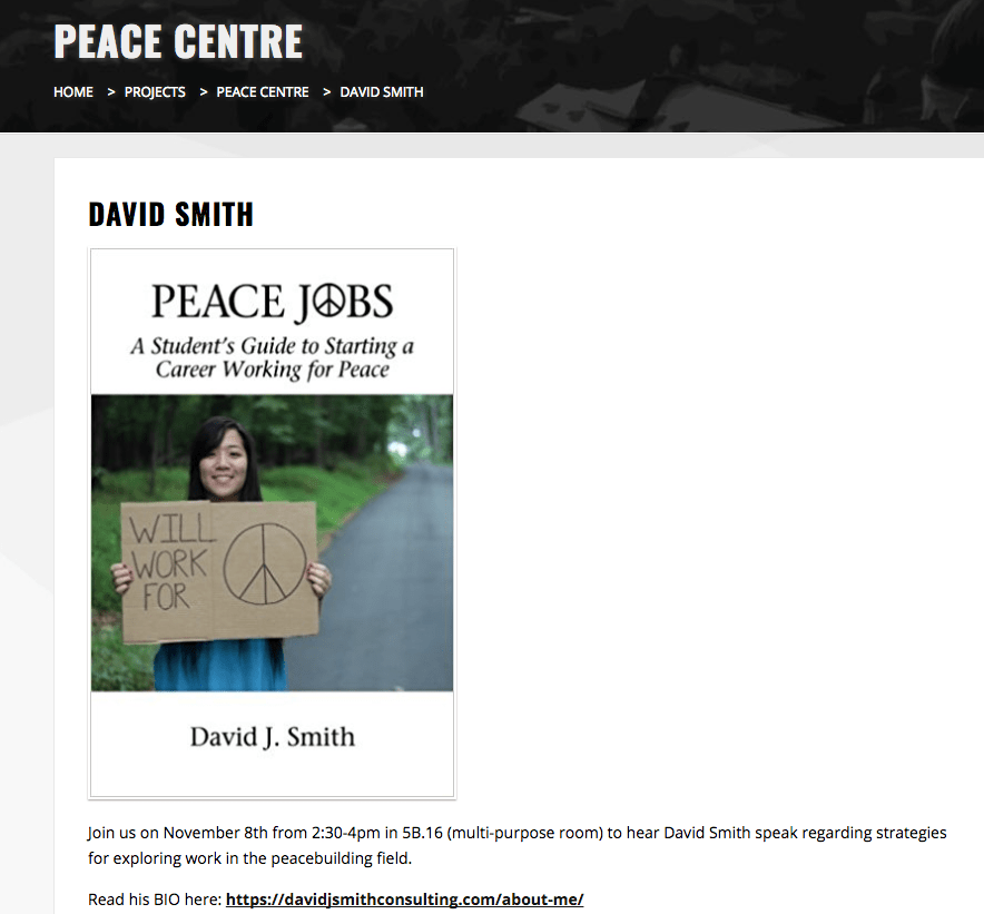 For my Canadian followers, I will be speaking at Dawson College in Montreal hosted by its Peace Centre on Wednesday, November 8 from 2:30-4:00 p.m. My talk will focus career awareness and peacebuilding. I will also be in Montreal for the AEE conference which starts on Thursday, November 9.
