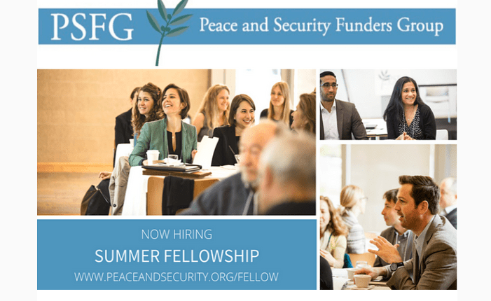 The Peace and Security Funders Group (PSFG) is seeking a part-time, paid Fellow for the summer of 2018 in our Washington, D.C. office. The Fellow will engage in a structured curriculum, which will provide weekly professional development sessions, as well as education on the philanthropic sector and the chance to be immersed in peace and security issues. The Fellow will also create a resume-building portfolio piece of their choice, attend relevant meetings around D.C., and support the work of PSFG with a variety of substantive, ongoing projects. PSFG aims to hire a candidate with a demonstrated commitment to diversity, equity, and inclusion, and an interest in peacebuilding, security, philanthropy, or related disciplines.