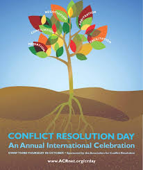 Today, October 18 is Conflict Resolution Day. The third Thursday of October has been promoted by the Association for Conflict Resolution as a day to advance the practice of resolving conflict and promoting peace.
