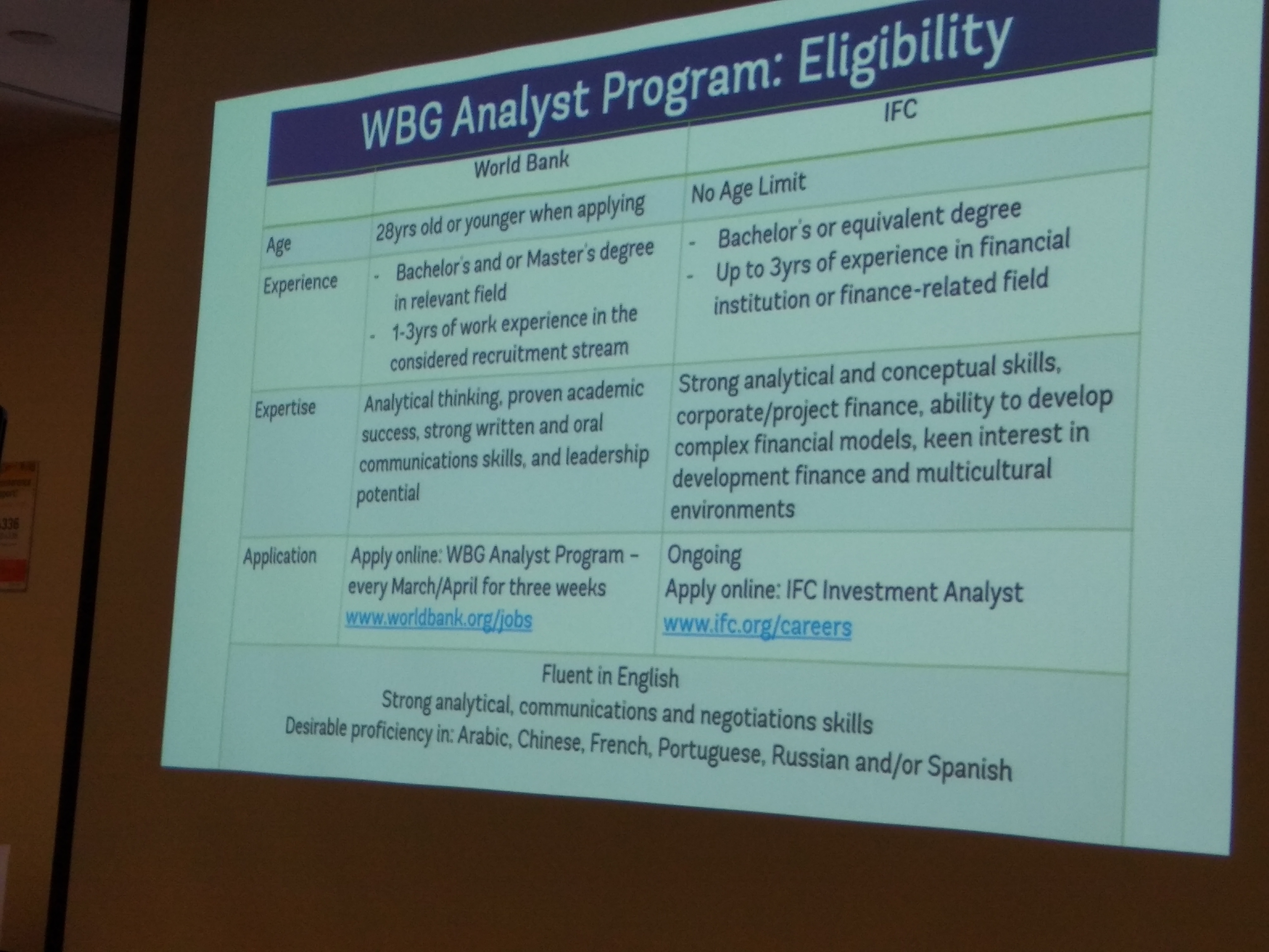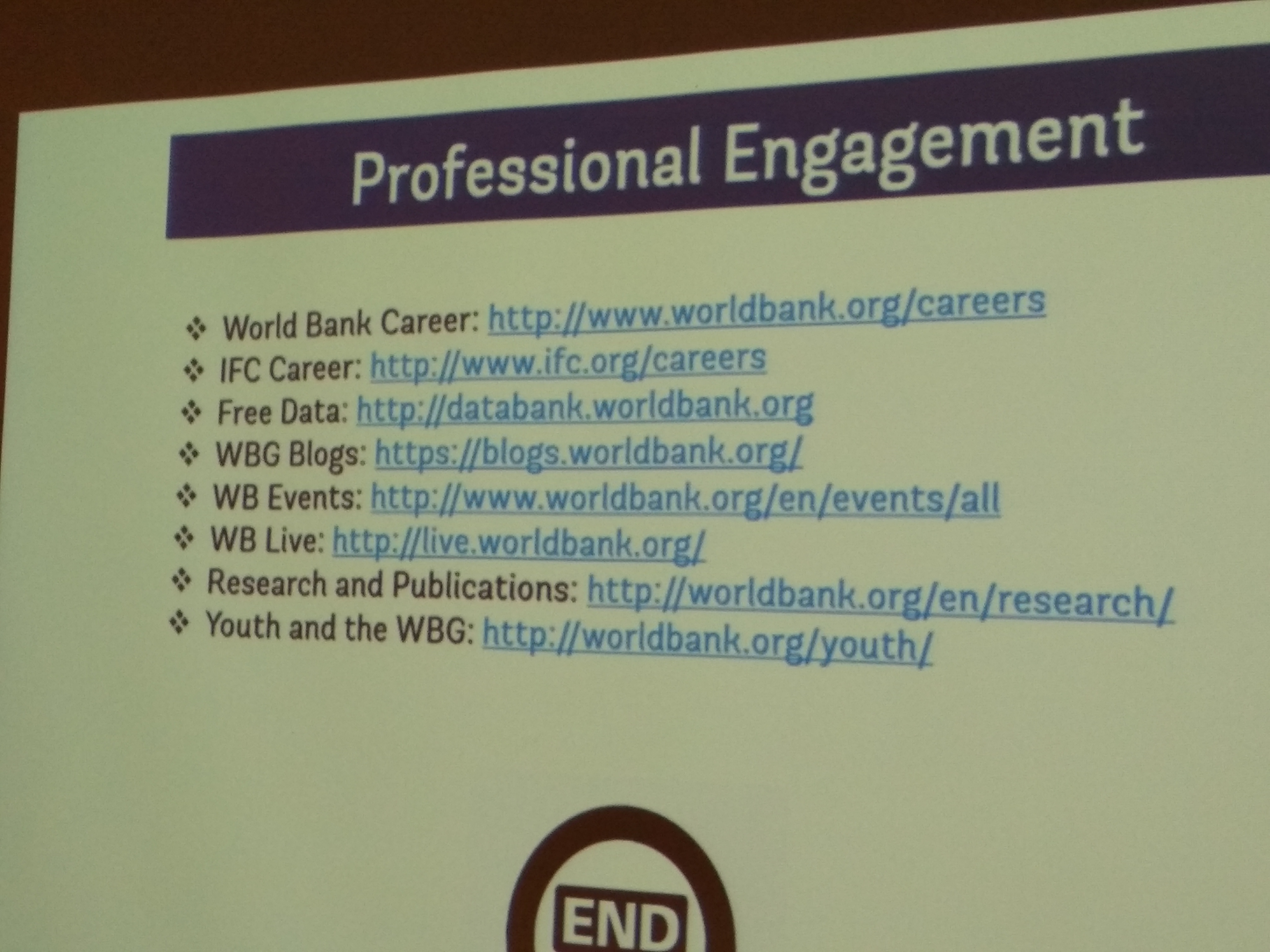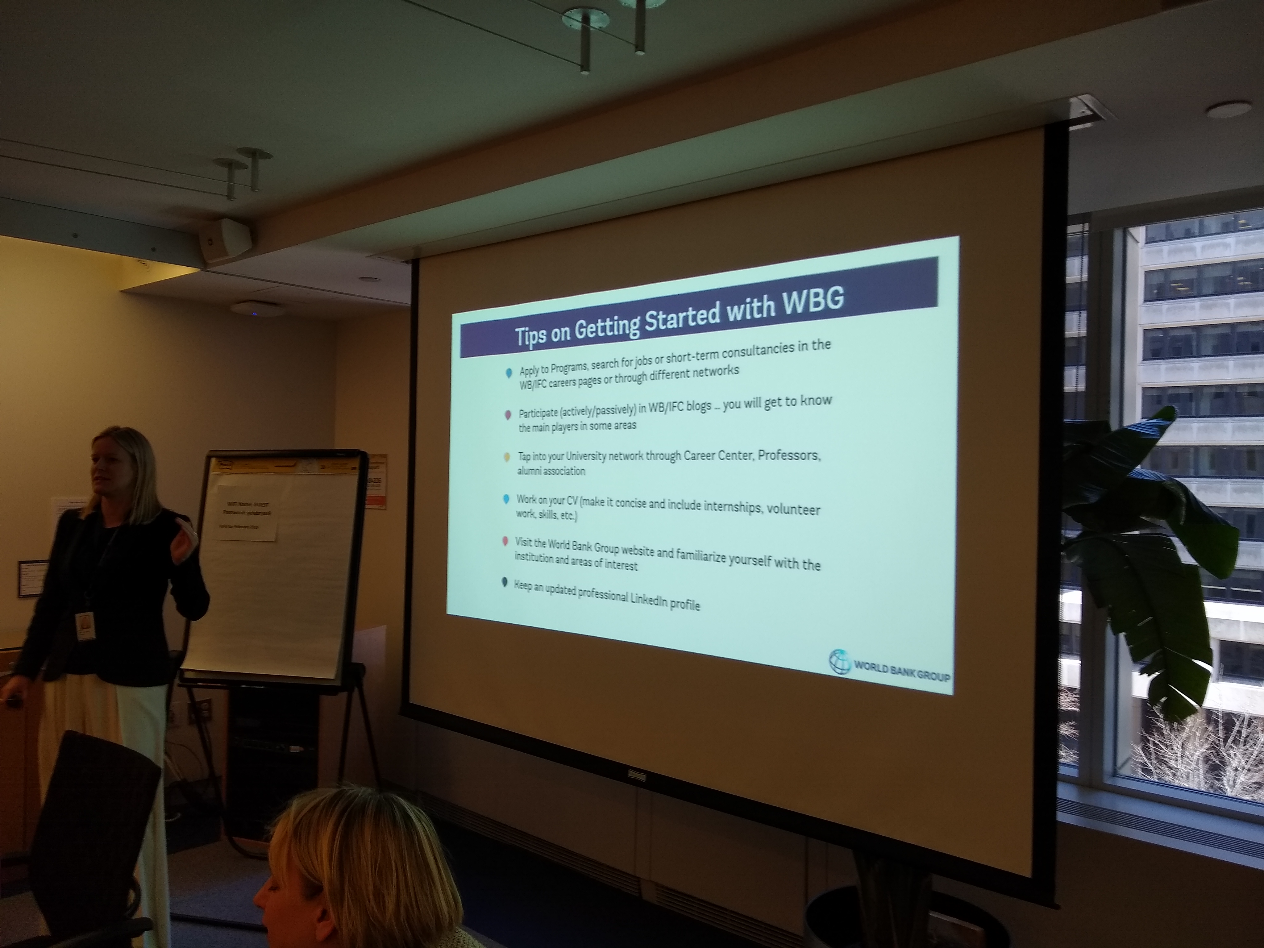 The career part of the briefing was hosted by Anna Frick who is a senior HR specialist and Natalia Moustafina who works in youth programs. Anna recommended using LinkedIn, which is used extensively at the WBG. Also when applying, make sure to tailor your CV and letter to the job you are applying for. They both shared with us opportunities in three primary programs: Young Professionals, Analyst Program, and Internships. The following photos of slides gives you the basics of each program. The Young Professionals Program or YPP is the oldest program started 55 years ago and is the most frequent pathway to a career at the WBG. The Analyst Program is relatively new and the Internship is designed for graduate students.