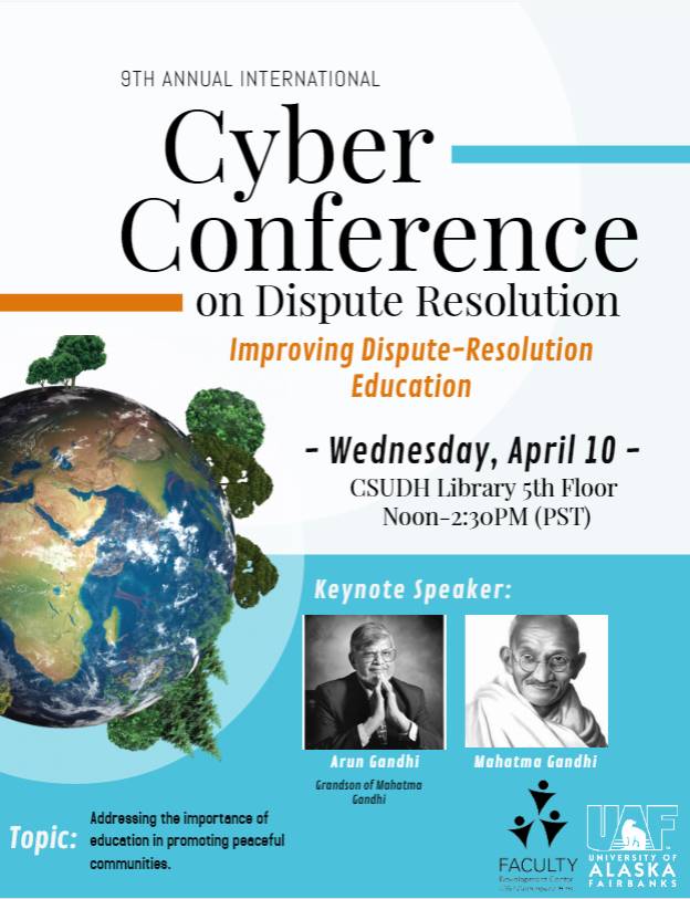 The 9th Annual International Cyber Conference on Dispute Resolution will be held on Wednesday, April 10, 2019 at CSU-Dominguez Hills. This year’s theme is “Improving Dispute-Resolution Education.” The keynote speaker will be Arun Gandhi, grandson of Mahatma Gandhi.