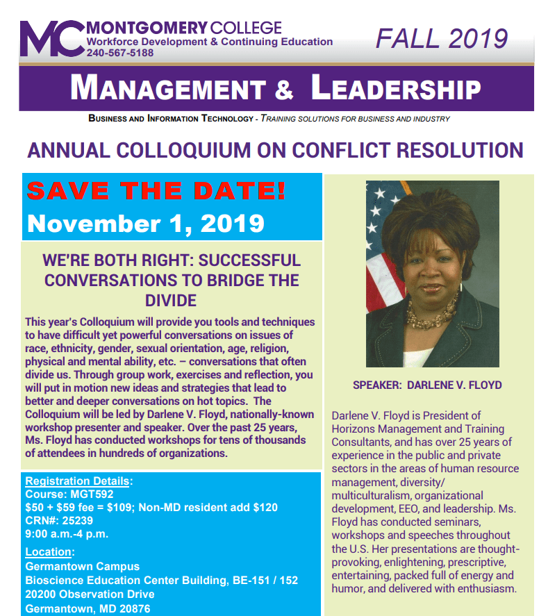 To find out more information or to register, go to this link: http://aceitoc.montgomerycollege.edu/course/courselistings.aspx. Click on Management and Leadership and look for MGT592: We’re Both Right listed under Coaching and Mediation. Note: Attendees over 60 may qualify for discounts off the regular registration costs.