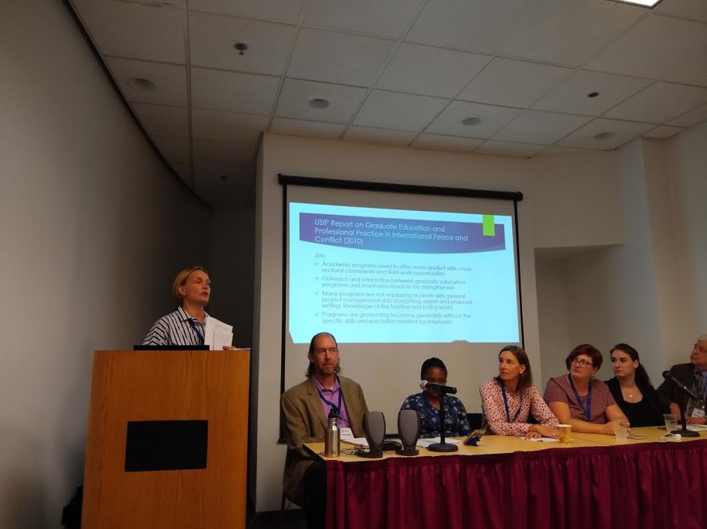 A panel on “Innovations in Peacebuilding Graduate Education” followed. This panel focused on USIP SR 246, Graduate Education and Professional Practice in International Peace and Conflict, which I co-authored in 2010 which at USIP. The lead of the panel, Ana Patel from Outward Bound Peacebuilding and panelist Tom Hill from New York University are looking at updating the report. Other panelists talking about graduate education and employment included Kimberly Hart from Search for Common Ground, Laura Descher from Rotary, Chip Hauss from AfP, Mary Mumbai from the University of Notre Dame, and Patricia Marquez from the University of San Diego. Many emphasizes the need for graduates to have monitoring and evaluation (M&E) skills, planning abilities, and the ability to develop a budget.