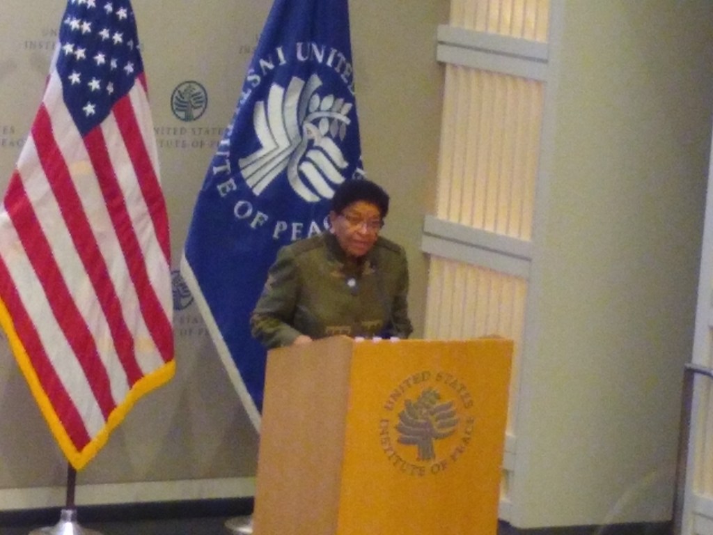 Day one (10/2) started in the Carlucci Auditorium at USIP. After USIP president Nancy Lindborg, Peace Direct and AfP chair Dylan Matthews, and AfP president Uzra Zeya welcomed the group, the keynote address was given by Ellen Johnson Sirleaf, Nobel Peace Prize Laureate and former president of Liberia. She spoke on the importance of women in the peace process in Liberia. Sirleaf had hope for the role that women can play in the bringing about stability and reminded us of the large numbers of women involved in government and civil society in Liberia and Rwanda.