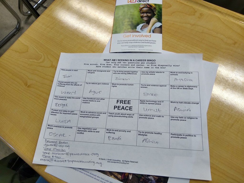 We engaged in career bingo which allows students to connect with each other in considering peacebuilding activities.