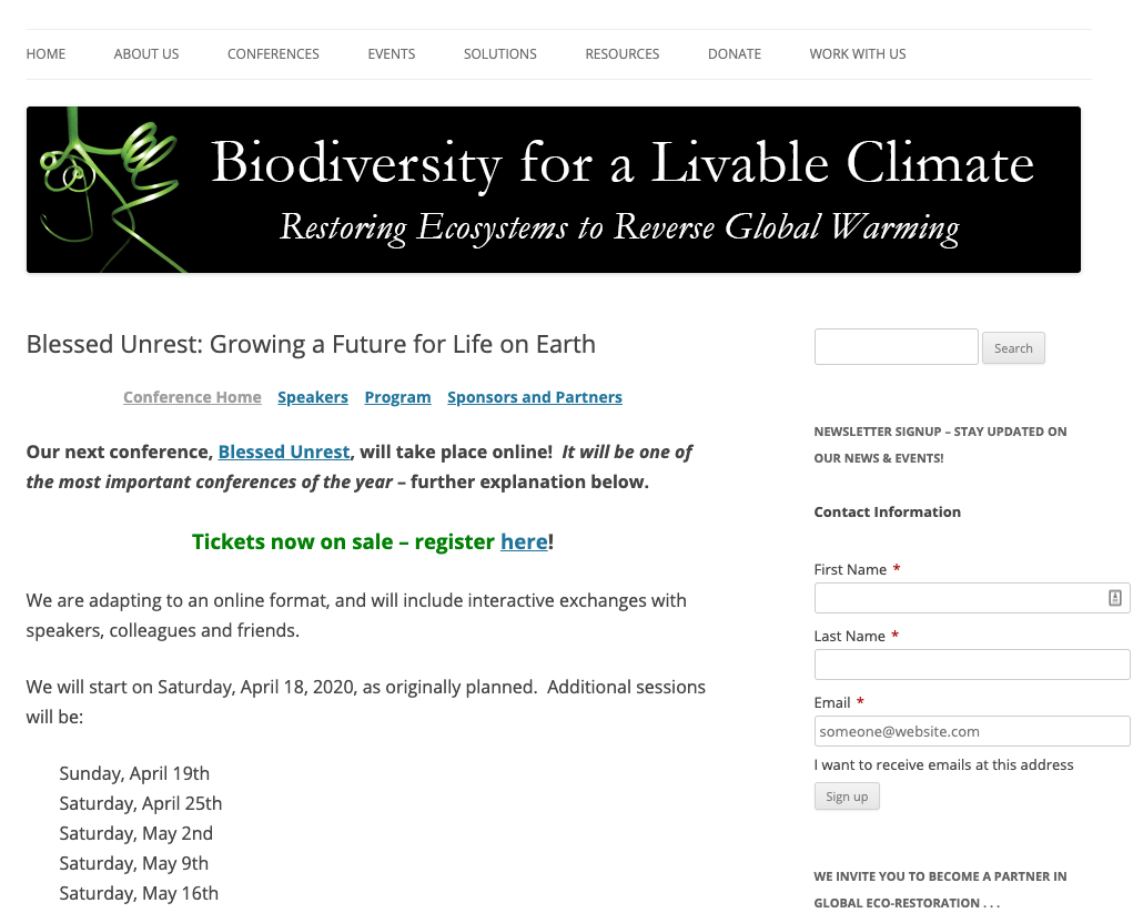 We will present a conference named after a 2007 book by Hawken: Blessed Unrest: How the Largest Social Movement in History Is Restoring Grace, Justice, and Beauty to the World. He describes how this movement “came into being and why nobody saw it coming.”