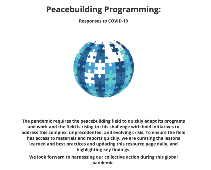 The Alliance for Peacebuilding has developed a resource page on COVID-19. The information, articles, and resources posted are good for those working in the field, be it domestic or international.