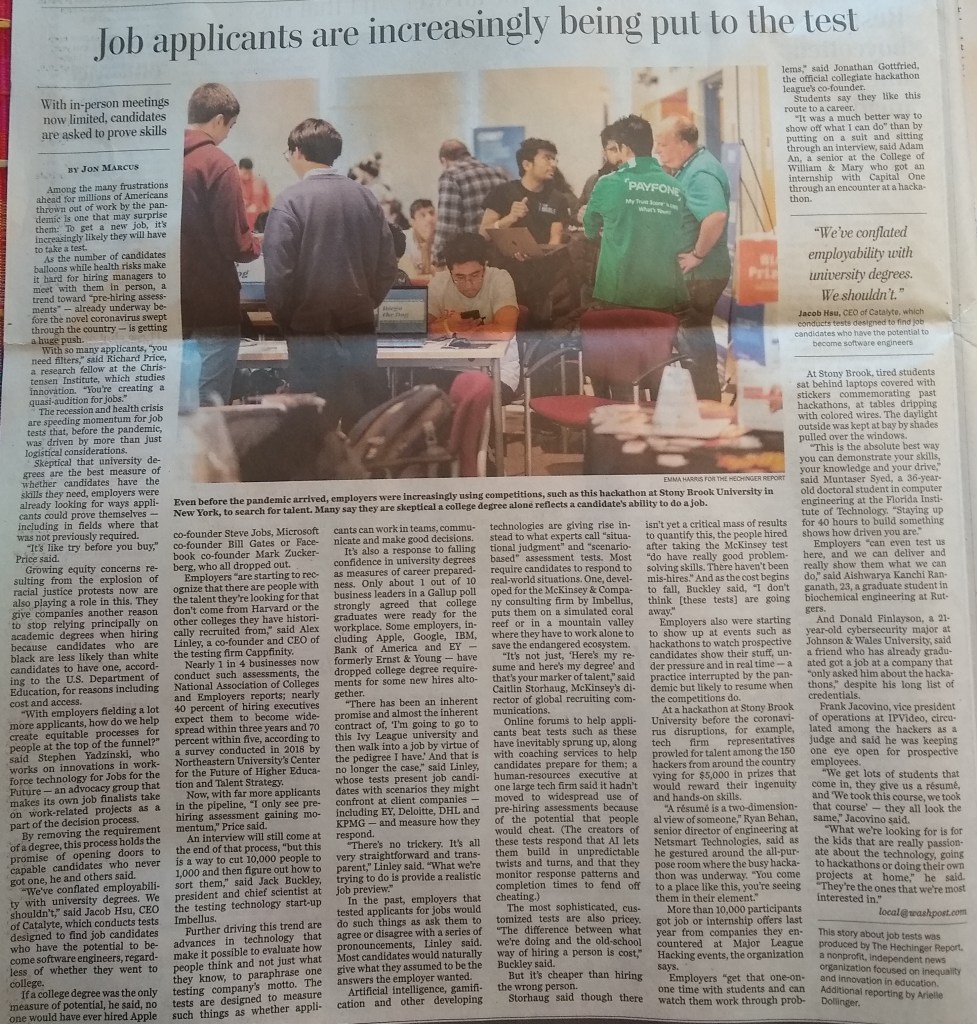 Jon Marcus in today’s Washington Post reports that increasingly employers are moving to testing of applicants and dispensing with the need for university degrees. I think this is a good sign in that not all jobs require degrees. And many of the degrees required might be community college based.