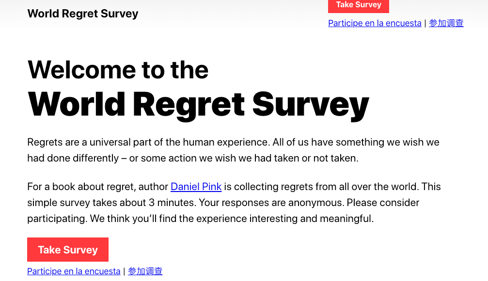 | The survey asks only four short questions. Your responses are anonymous. And your contribution will be a huge help in understanding this complex topic. (You can even complete the survey in Chinese or Spanish.) Once you’re at the site, you’ll also be able to use our nifty interactive map to see regrets already submitted from more than 3,000 people in dozens of countries and most U.S. states. Thanks for considering. Even more, thanks for inspiring this new book. It’s a writer’s joy to connect with readers like you. |