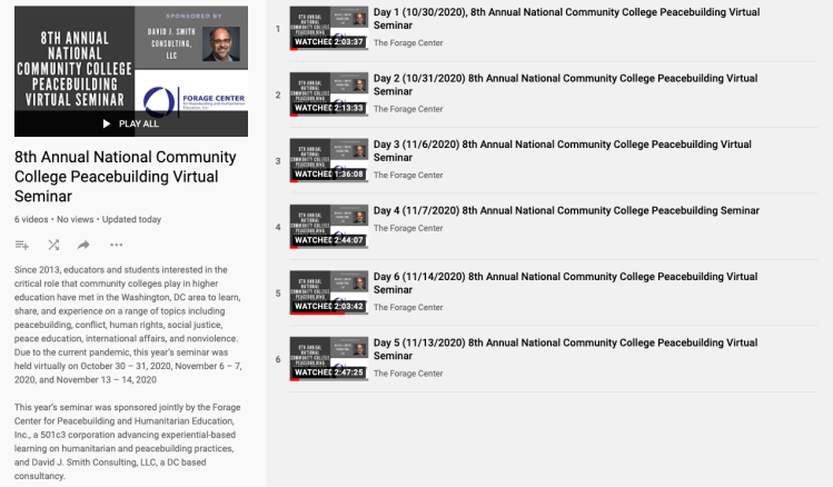 The 8th Annual National Community College Peacebuilding Seminar ended on Saturday, 11/14/20. It was held over three consecutive Fridays and Saturdays: 10/30-31, 11/6-7, and 11/13-14. Nearly 60 faculty, administrators and students attended – the largest number to date. The large number, the virtual setting, and the reduced costs to attend, suggests benefits for virtual gatherings.