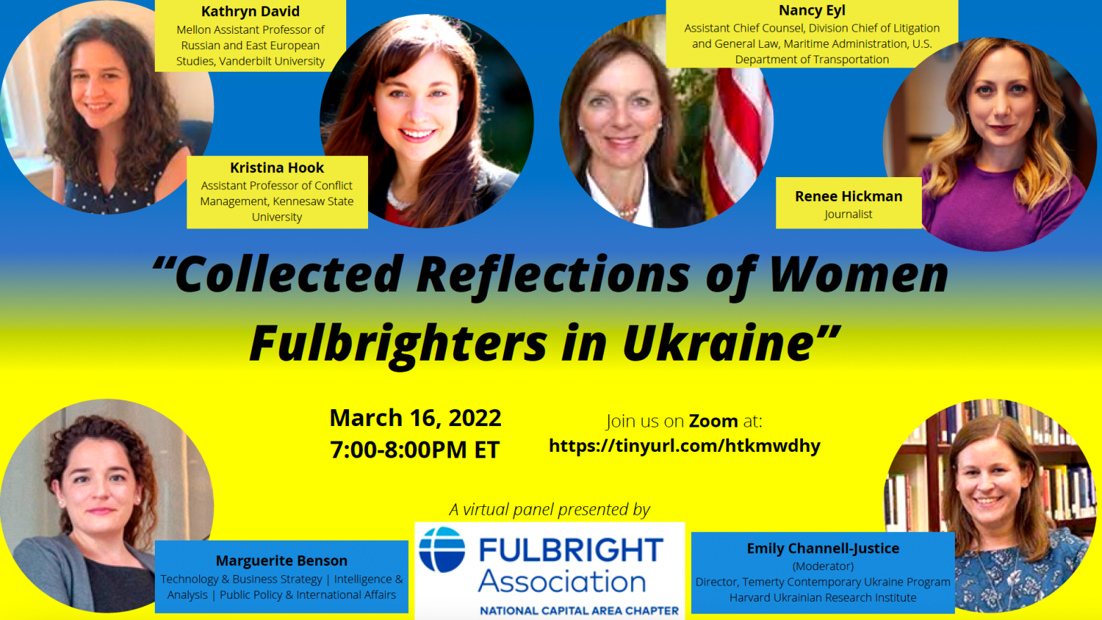 The National Capital Area Chapter of the Fulbright Association is hosting an event on Wednesday, 3/16 at 7 p.m. by Zoom featuring women from the U.S. who were awarded Fulbright grants in Ukraine. They will share their experiences in the country. Join us.
