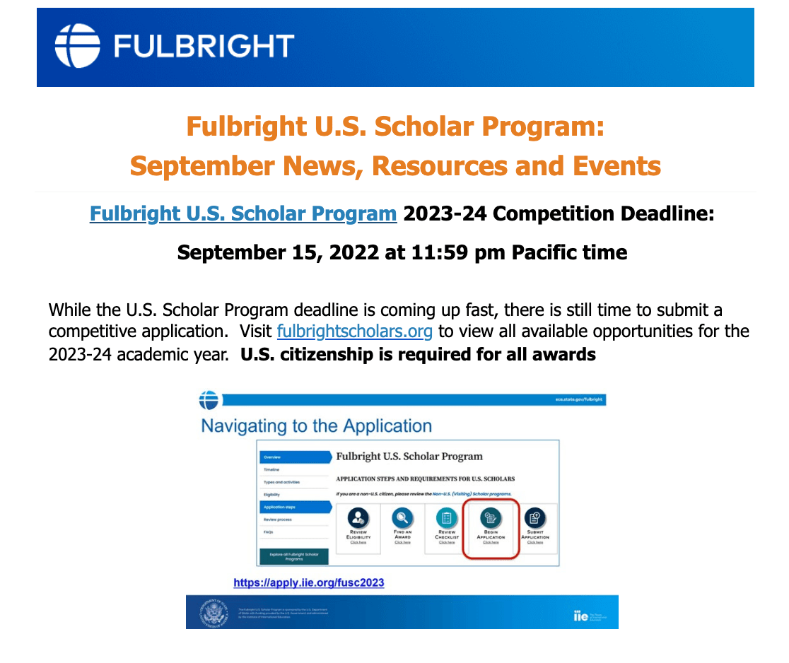 While the U.S. Scholar Program deadline is coming up fast, there is still time to submit a competitive application. Visit fulbrightscholars.org to view all available opportunities for the 2023-24 academic year. U.S. citizenship is required for all awards