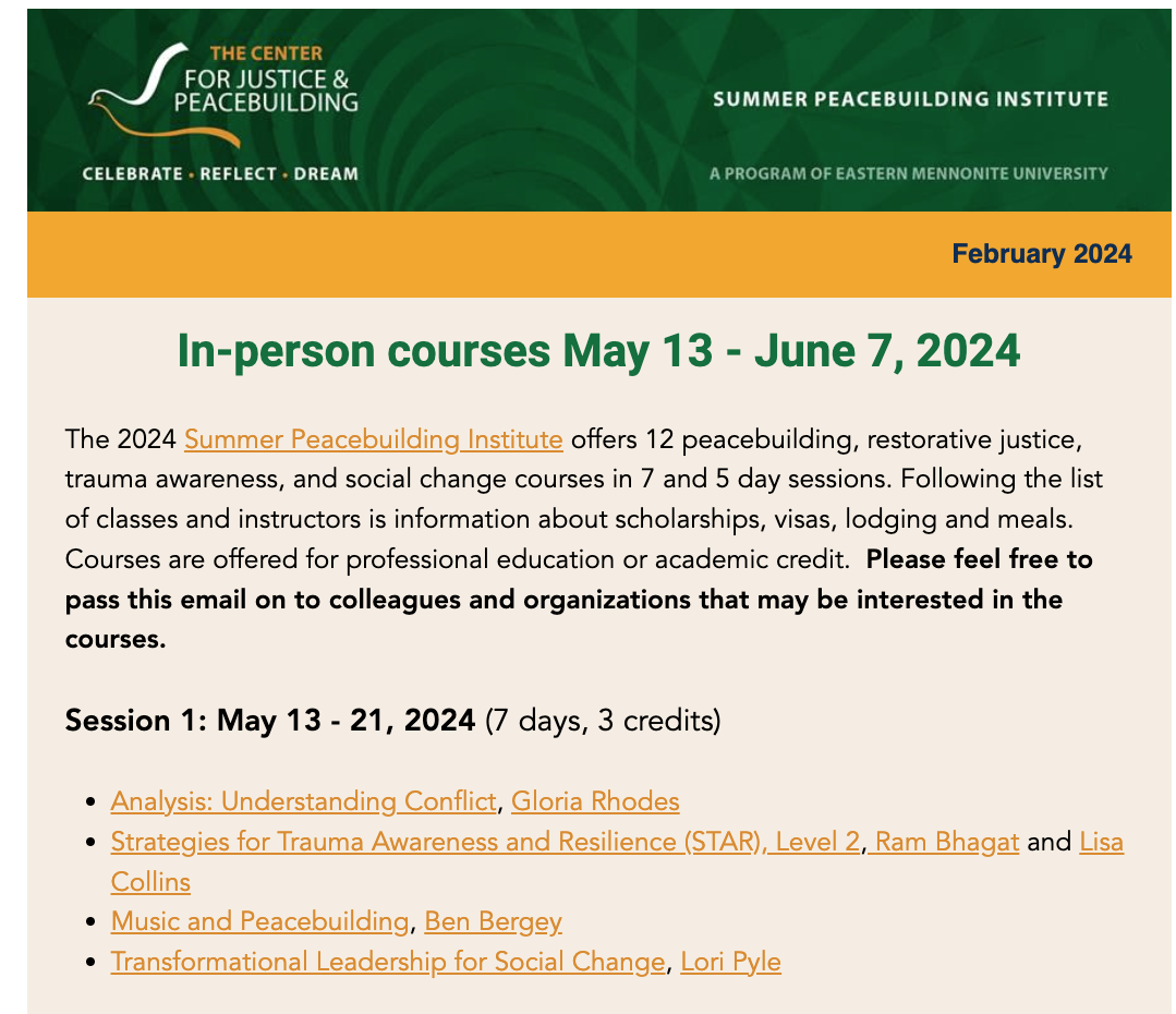 Peacebuilders looking for a summer program, might consider the highly respected Summer Peacebuilding Institute at Eastern Mennonite University.