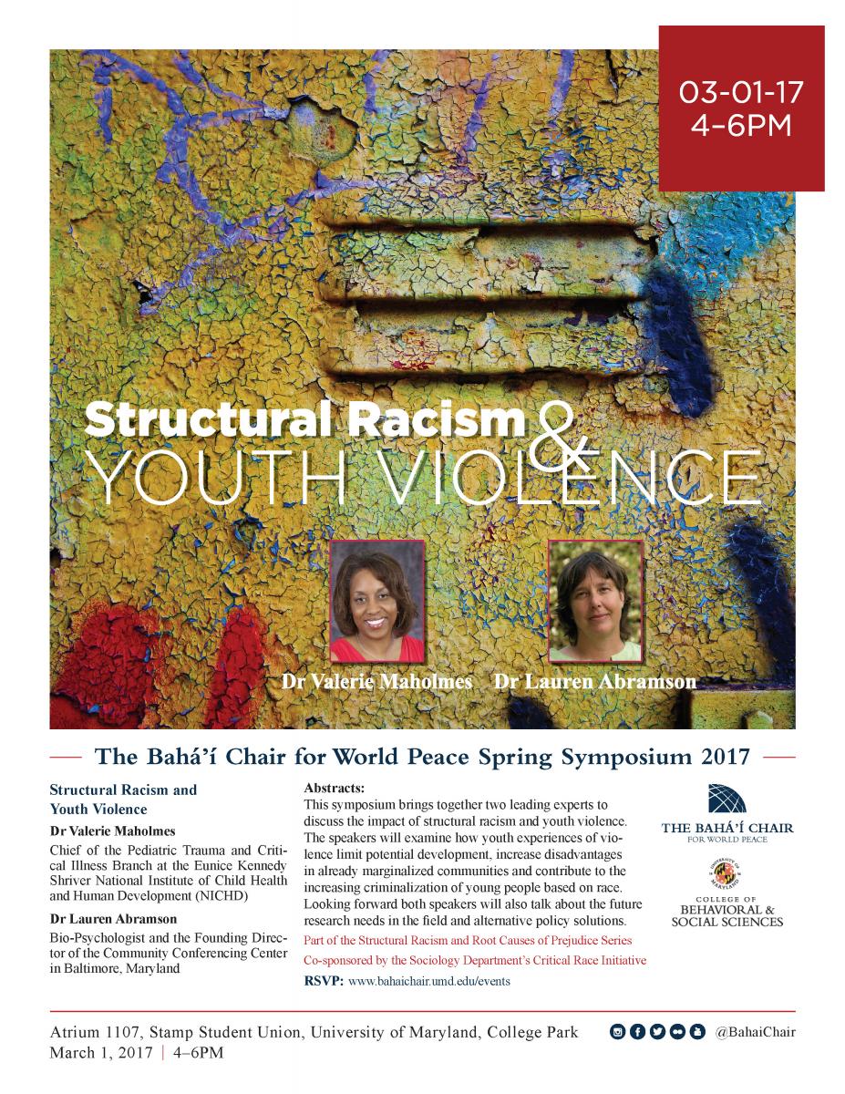 By: David J. Smith, February 22, 2017 The Bahá’í Chair for World Peace invites you to attend this upcoming symposium on Structural Racism and Youth Violence. This symposium brings together two leading experts to discuss the impact of structural racism and youth violence. The speakers will examine how youth experiences of violence limit potential development,ContinueContinue reading “Structural Racism and Youth Violence, University of Maryland, 3/1”