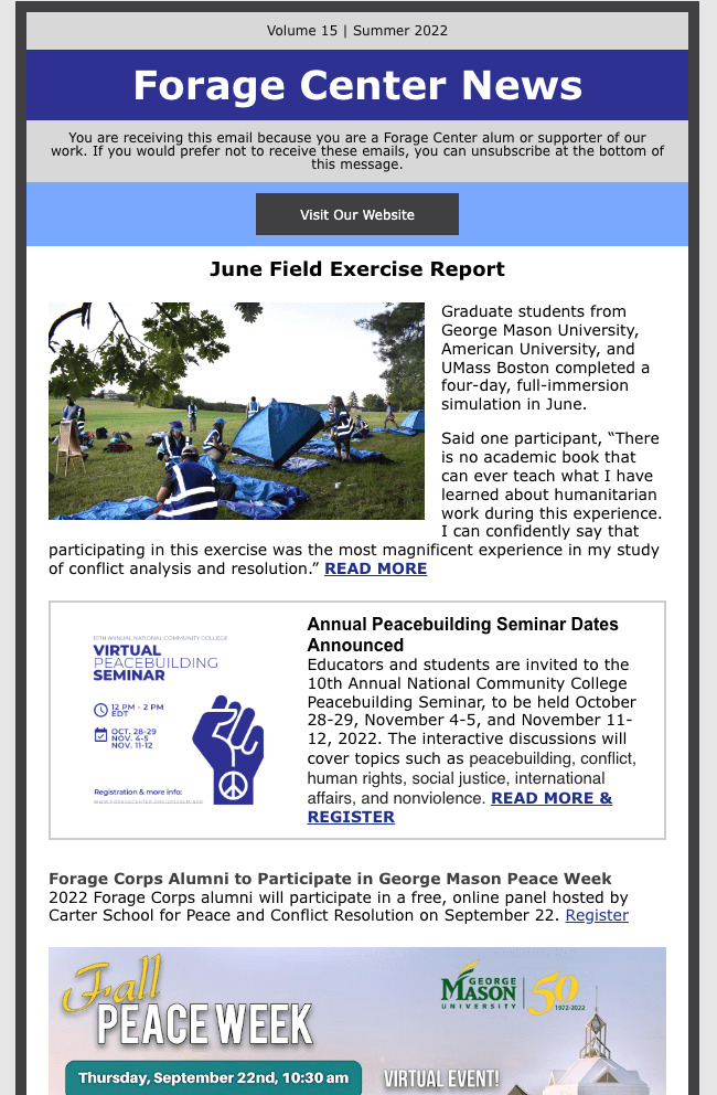 The Forage Center News is out! If you are interested in humanitarian or peacebuilding training and education, it is a must read! Click here.