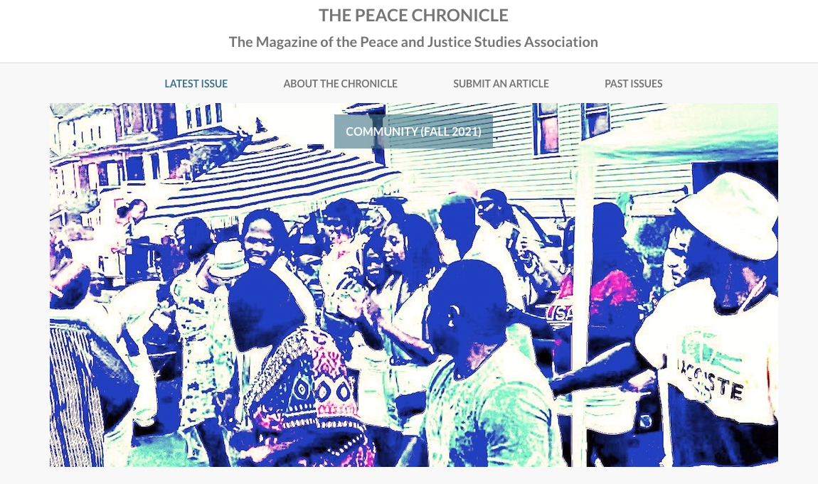 Guest Editor: Laura Finley Editor: Wim Laven We are seeking contributions for our winter 2022 edition of The Peace Chronicle Magazine. The theme is “Teaching Peace,” and we are interested in contributions from teachers/educators of all sorts (k-12, higher ed, vocational, etc.) as well as students at all levels. Short articles, essays, poems, artwork and photography areContinueContinue reading “Call for Contributors: PJSA’s The Peace Chronicle, Winter 2022: Theme: Teaching Peace & Current Edition, Fall 2021”