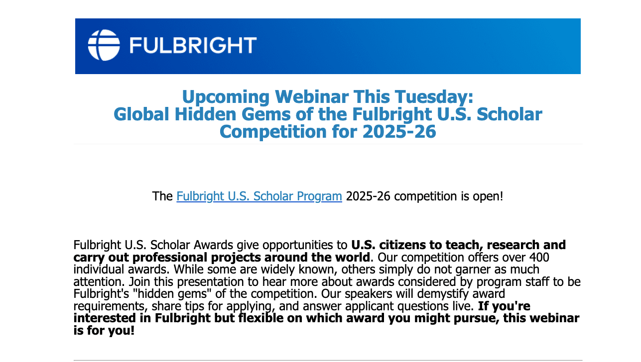 Information about the Fulbright U.S. Scholar Program is here. The 2025-26 competition is open!