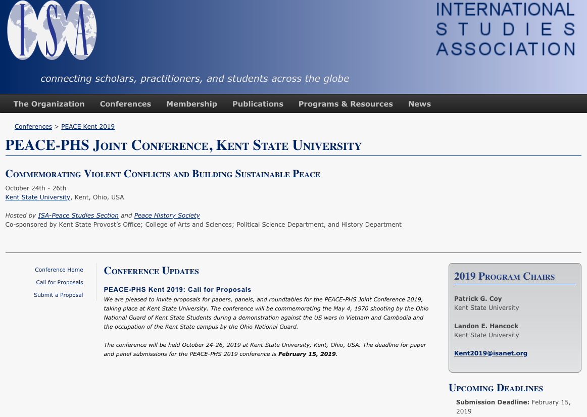 ISA Conference: Commemorating Violent Conflicts and Building Sustainable Peace, Kent State University, 10/24-25/19