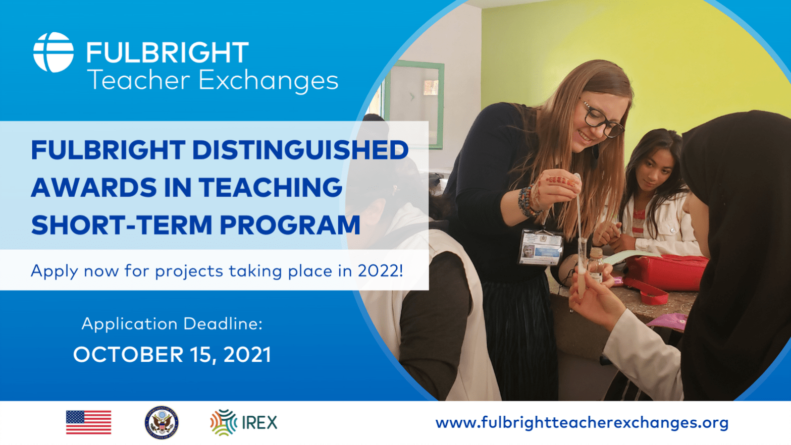 Ever dreamed of sharing your teaching expertise with peers in another country? Expert K–12 educators from the United States can travel to participating countries and territories abroad to carry out short-term educational projects through the Fulbright Distinguished Awards in Teaching Short-Term Program. Participants spend 2-6 weeks working in schools, teacher training colleges, government ministries, and/or educational nongovernmental organizations,ContinueContinue reading “Fulbright Distinguished Awards for Teaching Short-Term Program”