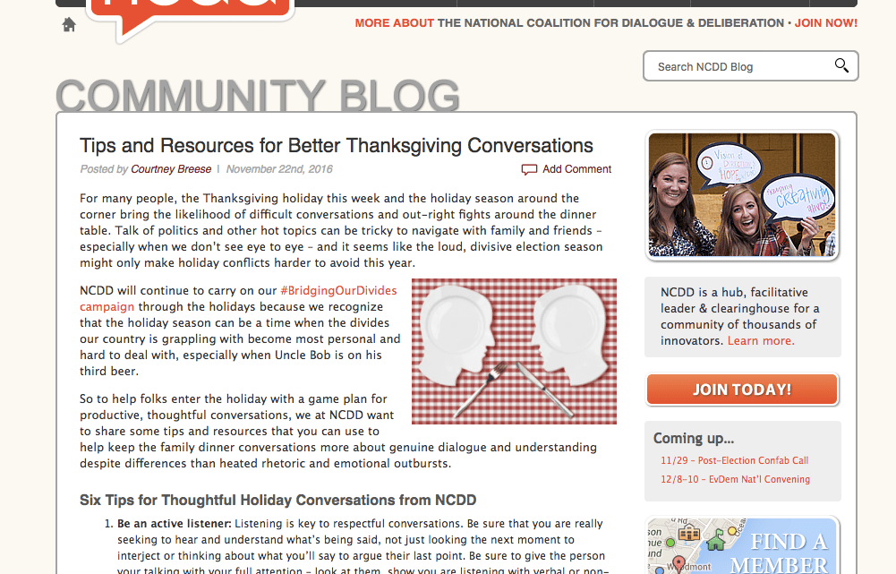 By: David J. Smith, November 22, 2016 The National Coalition for Dialogue and Deliberation has developed some tips for Thanksgiving conversation. Click below.