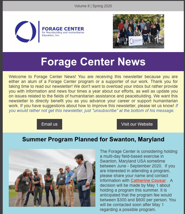 The Forage Center is a 501c3 organization that advances humanitarian and peacebuilding education and training with students and professionals. Our main offerings are field-based programs in the U.S. that simulate complex emergencies in order to provide those interested a chance to develop their skills. A summer 2020 program – sometime between June and September basedContinueContinue reading “Summer Simulation-Based Humanitarian Program In Planning Stages, Summer 2020, Contact by 5/1/20”