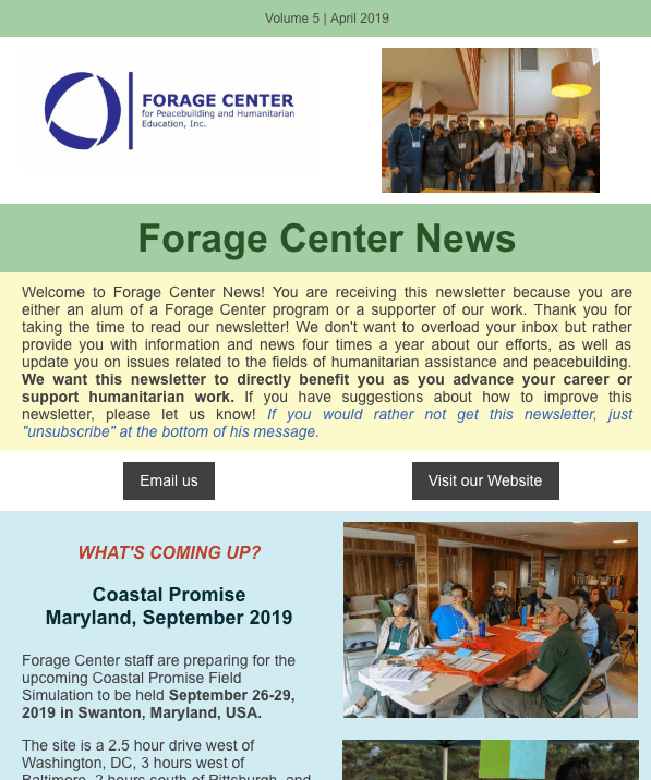 The current edition of the Forage Center News is out! Learn about our work at the Forage Center for Peacebuilding and Humanitarian Education and read about our newest board member – Kathryn Rzeszut – who is interviewed by Catherine Cousar. Click here to read more!