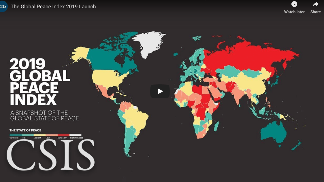 The Human Rights Initiative of the Center for Strategic and International Studies (CSIS) invites you to a public launch event of the 2019 Global Peace Index (GPI). The Global Peace Index is the world’s leading measure of global peacefulness, ranking 163 countries and territories according to their level of relative peacefulness. Created by the InstituteContinueContinue reading “Global Peace Index 2019 Launch, CSIS, Washington, DC, 6/20/19”