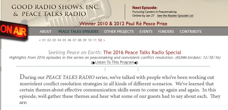 By David J. Smith, December 25, 2016 Peace Talks Radio is a nationally broadcasted program carried on 60 public radio stations in the U.S. This program (click below) is the year end one featuring highlights from 2016. If you have an hour, it’s worth your listen. I will be the guest for the firstContinueContinue reading “Peace Talks Radio End of Year Broadcast”