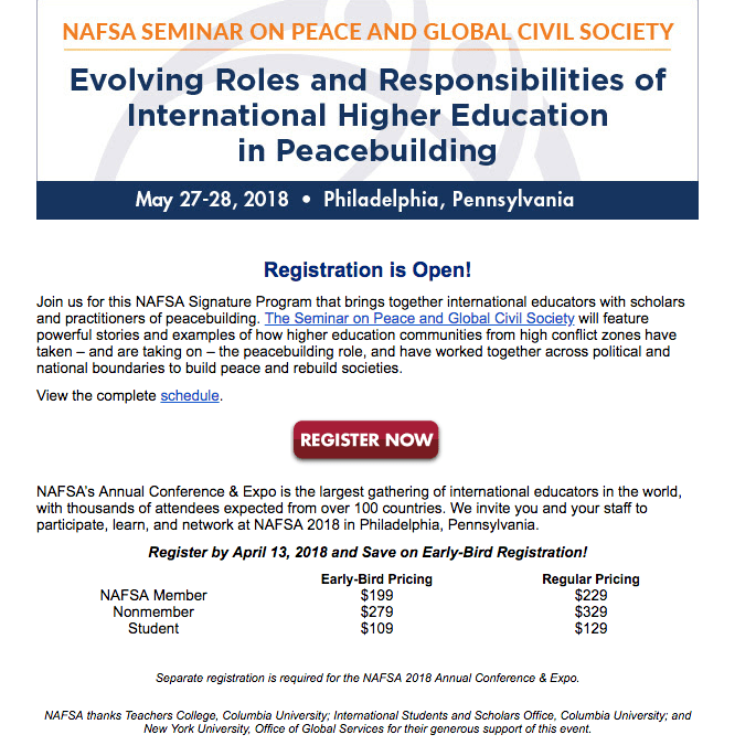 If you are an international education educator, consider this event at the upcoming NAFSA conference on peacebuilding. Promises to be a good event! Click here or below for more information.