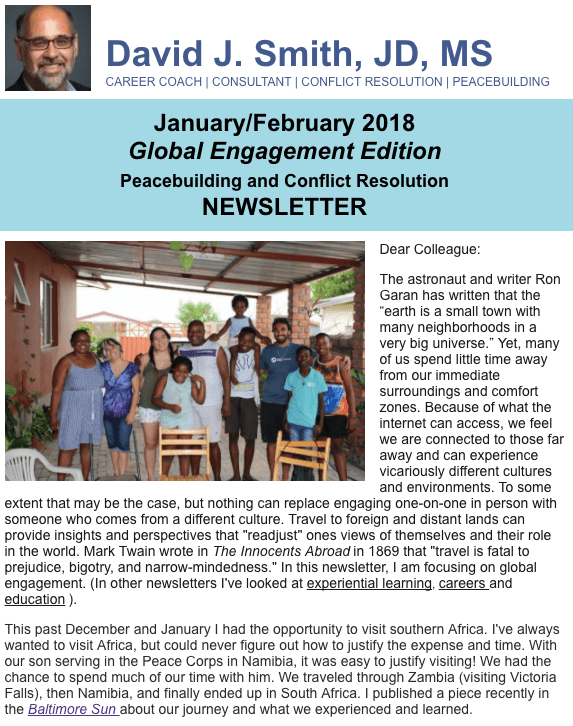 Today I published an op-ed in the Baltimore Sun about my recent trip to southern Africa including Zambia, Namibia, and South Africa. We spent much of our time with our son who is serving in the Peace Corps in Namibia. We also visited Robben Island where Nelson Mandela spent 18 years. The piece is aContinueContinue reading “My Op-Ed: Building a Better World Through Travel Abroad, Baltimore Sun, 1/23/18”