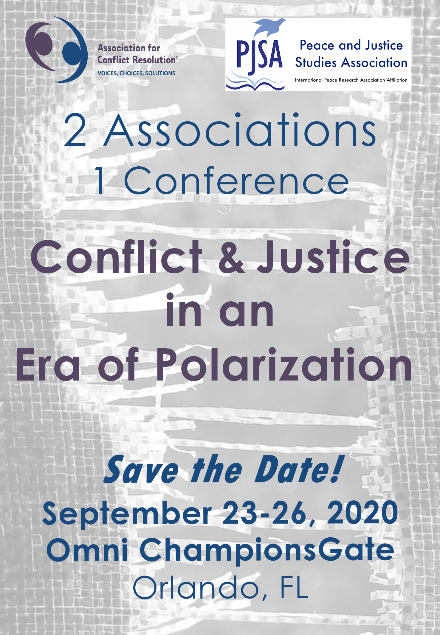 The 2020 conference, “Conflict & Justice in an Era of Polarization,” brings together two associations that provide leadership in the work for peace, justice, and conflict resolution in the world. The Peace & Justice Studies Association (PJSA) and The Association for Conflict Resolution (ACR) are pleased to announce our first jointly sponsored annual conference. The PJSA andContinueContinue reading “Peace & Justice Studies Association and Association for Conflict Resolution 2020 Join Annual Conference, Orlando, 9/23-9/26/20: Call for Proposals”
